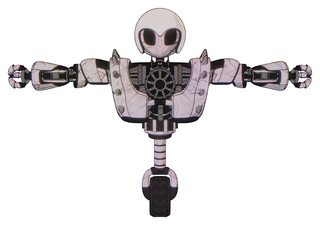 Robot containing grey alien style head and black eyes and helmet and heavy upper chest and heavy mech chest and shoulder spikes and unicycle wheel. Sketch pad doodle lines. T-pose.