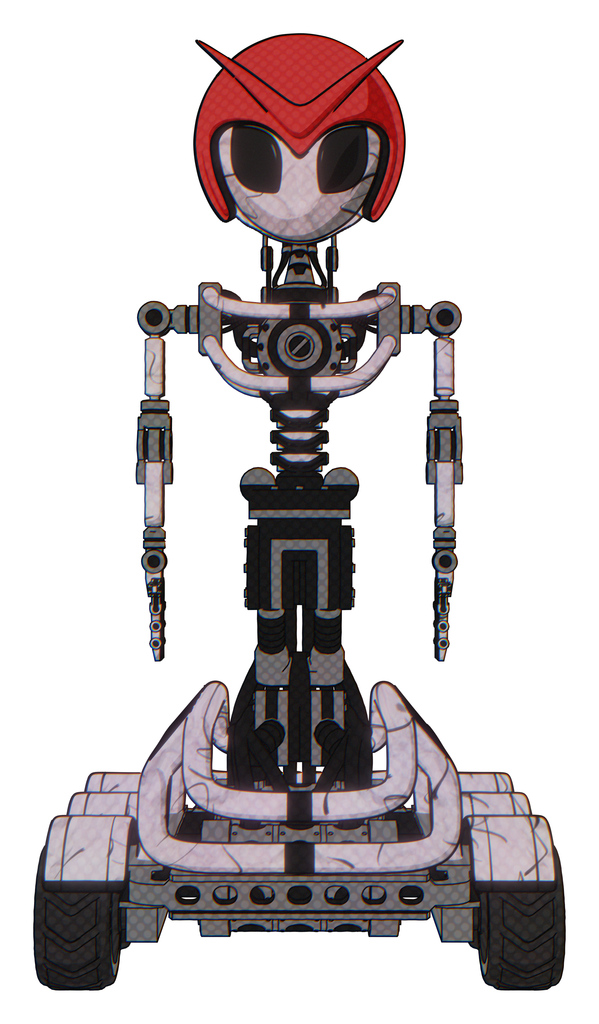 Droid containing grey alien style head and black eyes and red v and red helmet and light chest exoshielding and no chest plating and six-wheeler base. Sketch pad doodle lines. Front view.