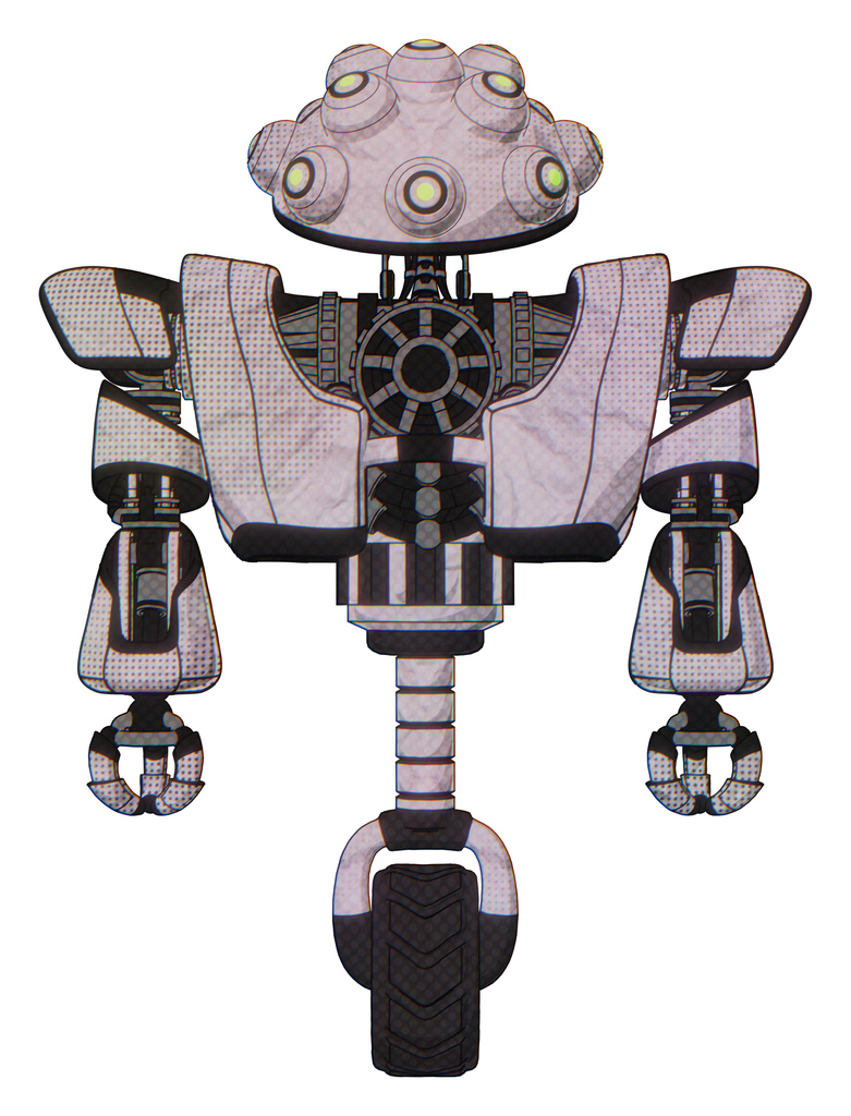 Automaton containing techno multi-eyed domehead design and heavy upper chest and heavy mech chest and unicycle wheel. Sketch pad dots pattern. Front view.