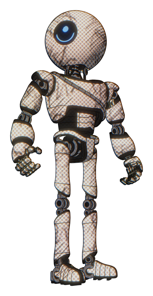 Cyborg containing dual retro camera head and round happy cyclops head and light chest exoshielding and cable sash and ultralight foot exosuit. Halftone sketch. Hero pose.