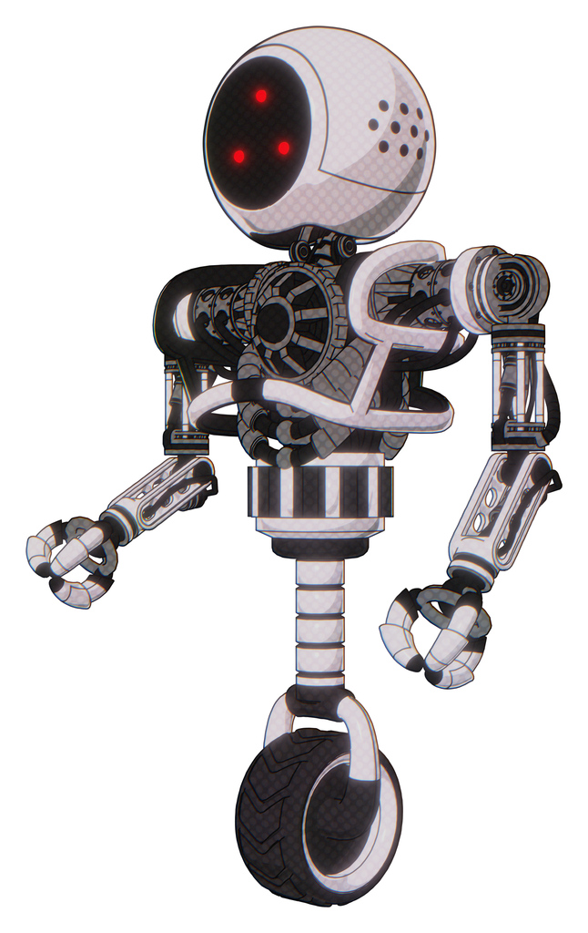 Cyborg containing three led eyes round head and heavy upper chest and no chest plating and unicycle wheel. White halftone toon. Facing right view.