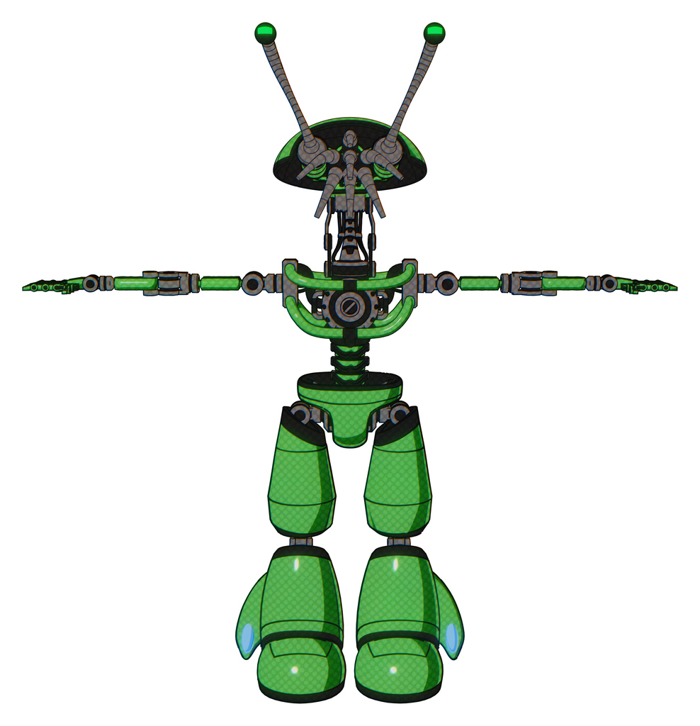 Mech containing dual retro camera head and shrimp head and light chest exoshielding and no chest plating and light leg exoshielding. Secondary green halftone. T-pose.