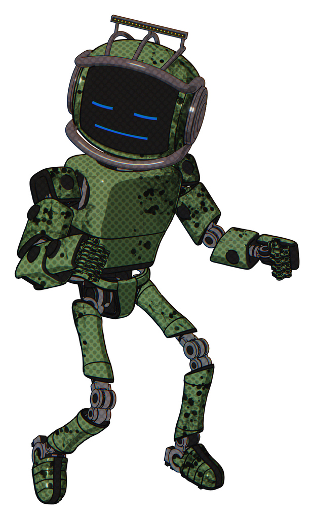 Droid containing digital display head and sleeping face and led and protection bars and light chest exoshielding and prototype exoplate chest and ultralight foot exosuit. Grunge grass green.