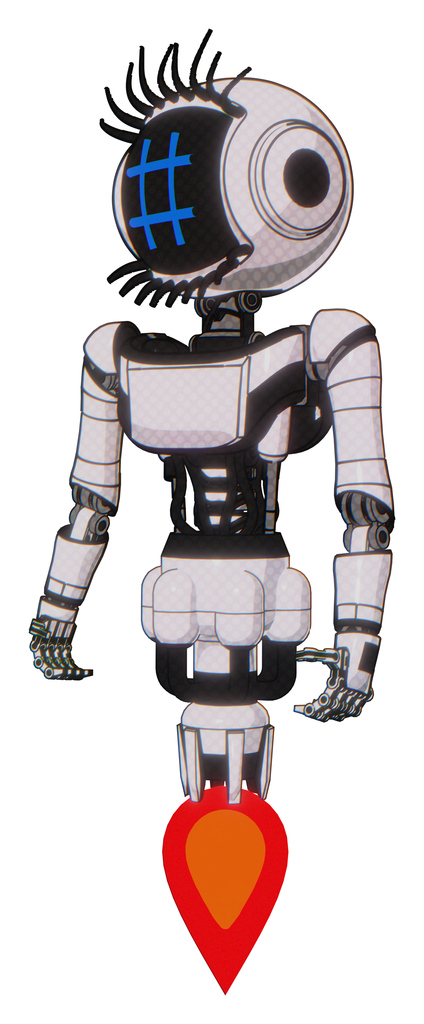 Cyborg containing digital display head and hashtag face and eye lashes deco and light chest exoshielding and ultralight chest exosuit and jet propulsion. White halftone toon.