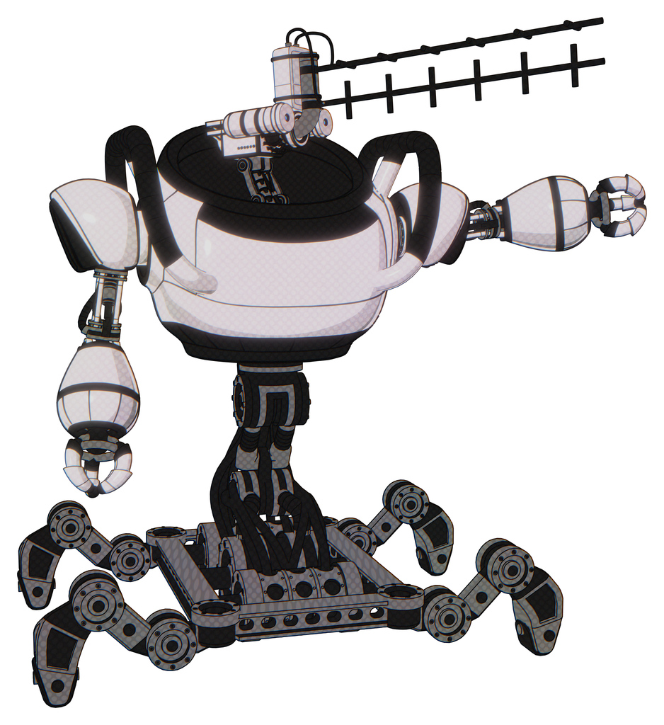 Robot containing dual retro camera head and wireless internet transmitter head and heavy upper chest and insect walker legs. White halftone toon. Pointing left or pushing a button..
