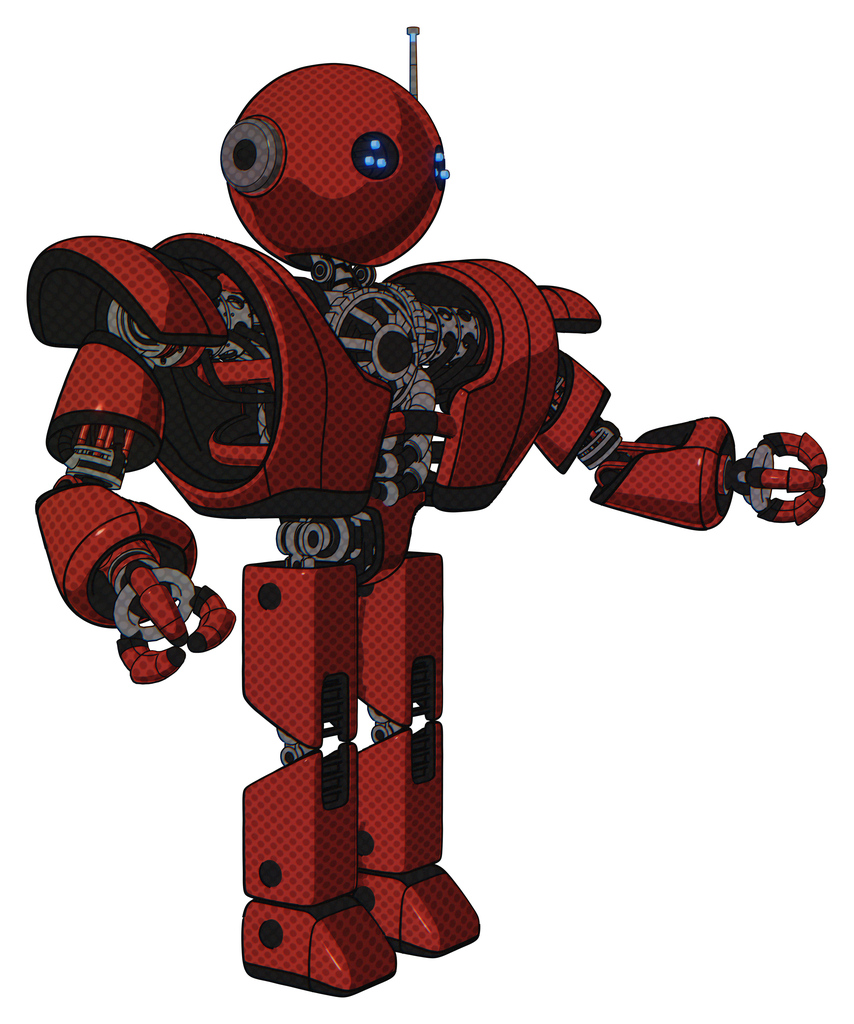 Mech containing oval wide head and blue led eyes and retro antenna with light and heavy upper chest and heavy mech chest and prototype exoplate legs. Cherry tomato red. Interacting.