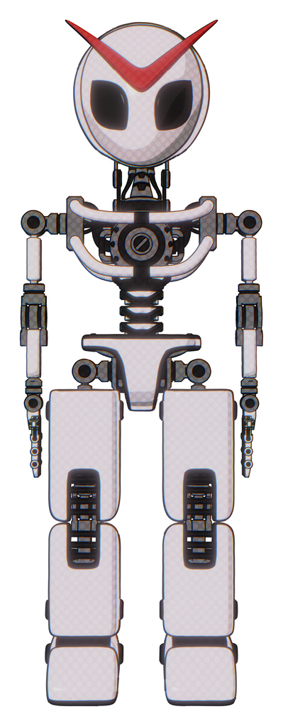Robot containing grey alien style head and black eyes and light chest exoshielding and no chest plating and prototype exoplate legs. White halftone toon. Front view.