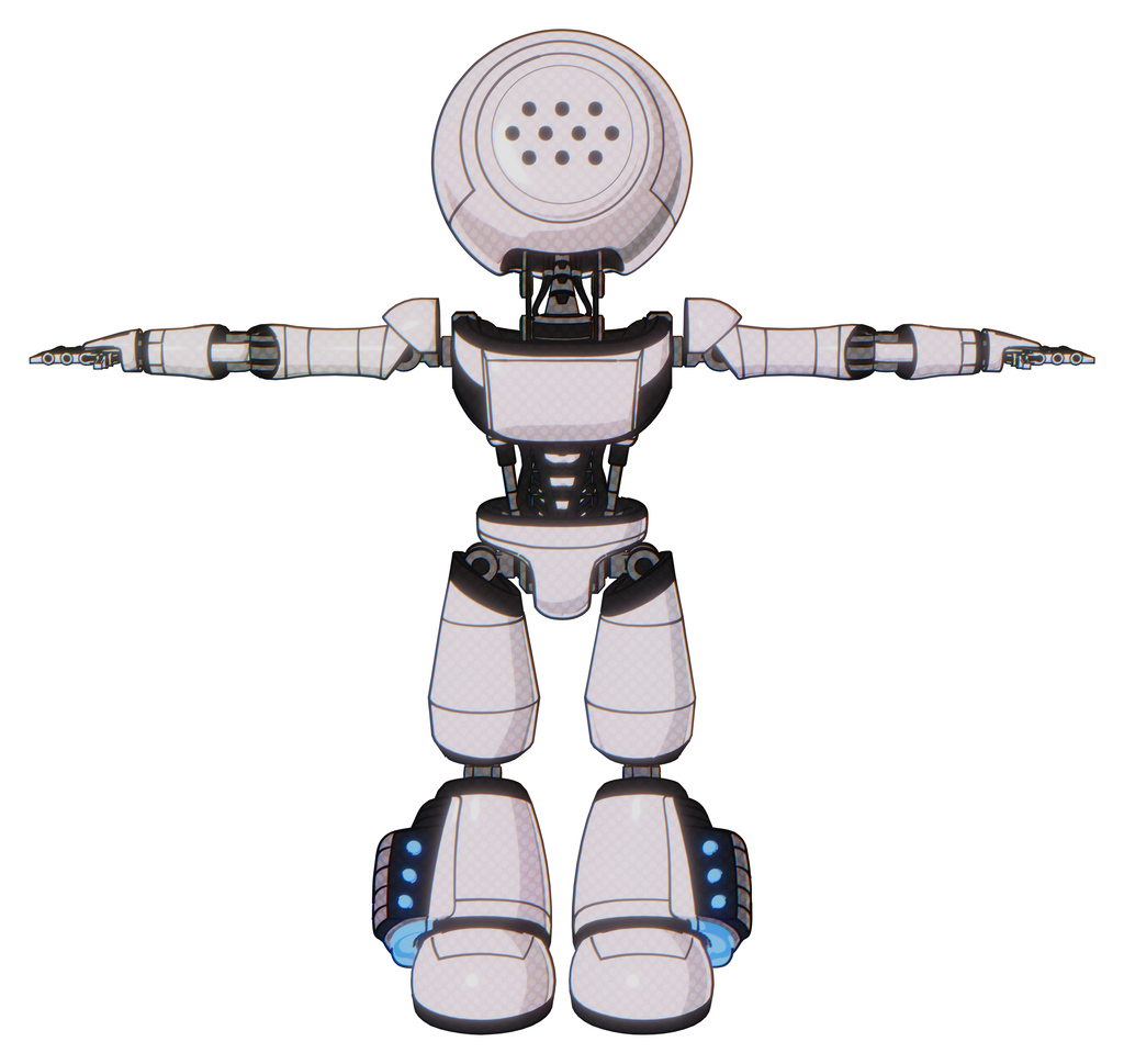 Automaton containing dots array face and light chest exoshielding and ultralight chest exosuit and light leg exoshielding and megneto-hovers foot mod. White halftone toon. T-pose.