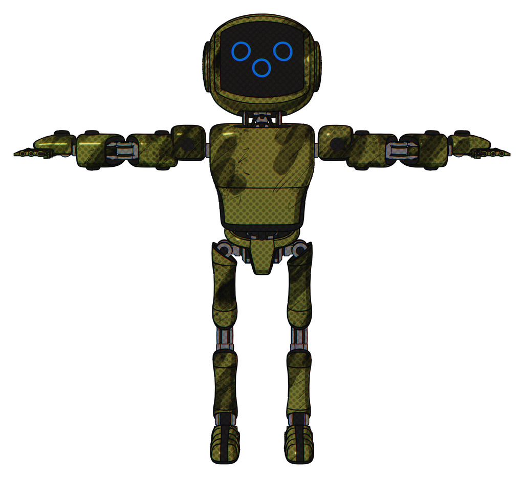 Droid containing digital display head and woo expression and light chest exoshielding and prototype exoplate chest and ultralight foot exosuit. Grunge army green. T-pose.