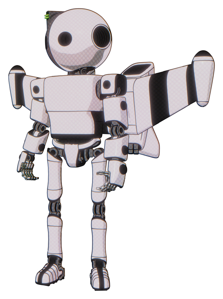 Robot containing oval wide head and green led ornament and light chest exoshielding and prototype exoplate chest and stellar jet wing rocket pack and ultralight foot exosuit. White halftone toon.
