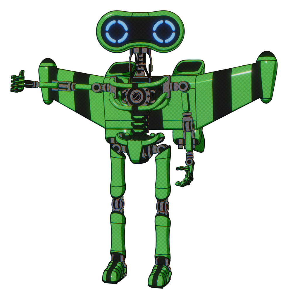 Mech containing dual retro camera head and retro 80's head and light chest exoshielding and stellar jet wing rocket pack and no chest plating and ultralight foot exosuit. Secondary green halftone.