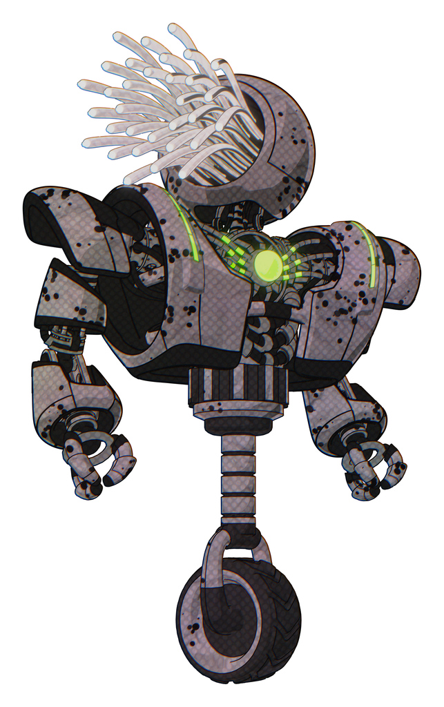 Mech containing round fiber optic connectors head and heavy upper chest and heavy mech chest and green energy core and unicycle wheel. Dark ink dots sketch. Hero pose.