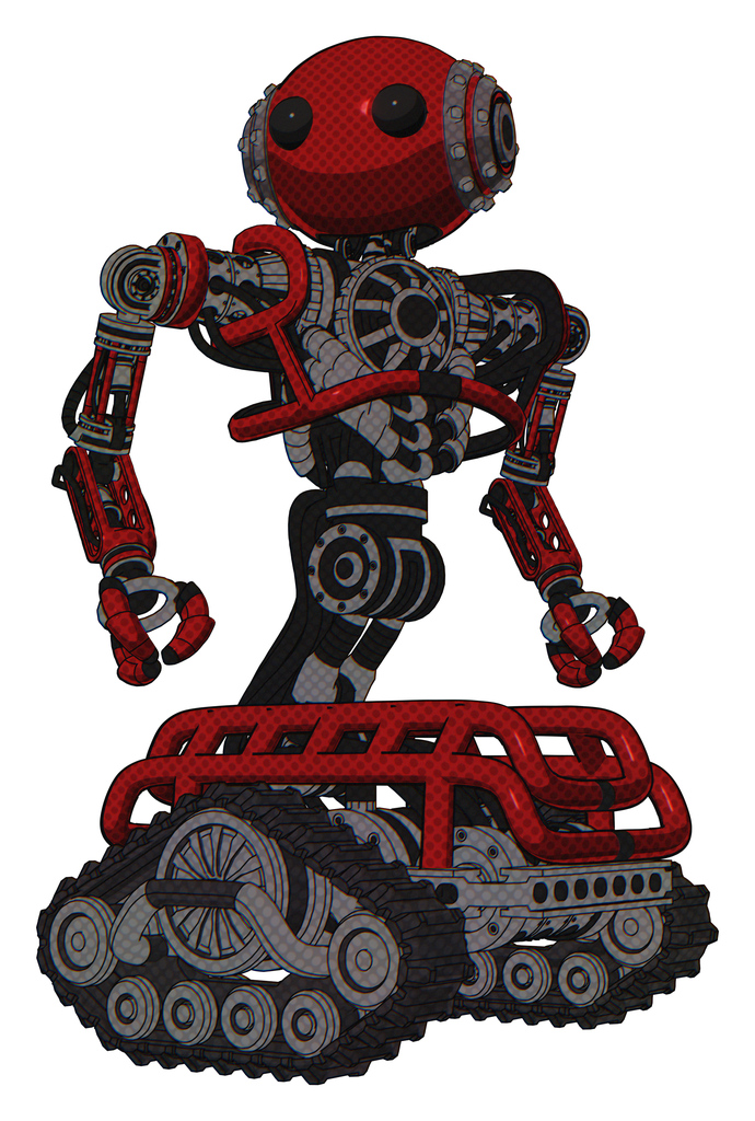 Cyborg containing oval wide head and beady black eyes and steampunk iron bands with bolts and heavy upper chest and no chest plating and tank tracks. Dark red. Hero pose.