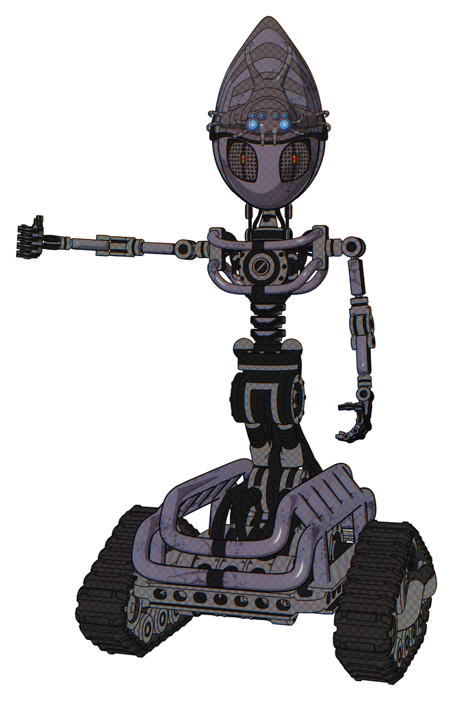 Mech containing grey alien style head and metal grate eyes and alien bug creature hat and light chest exoshielding and no chest plating and tank tracks. Light lavender metal.