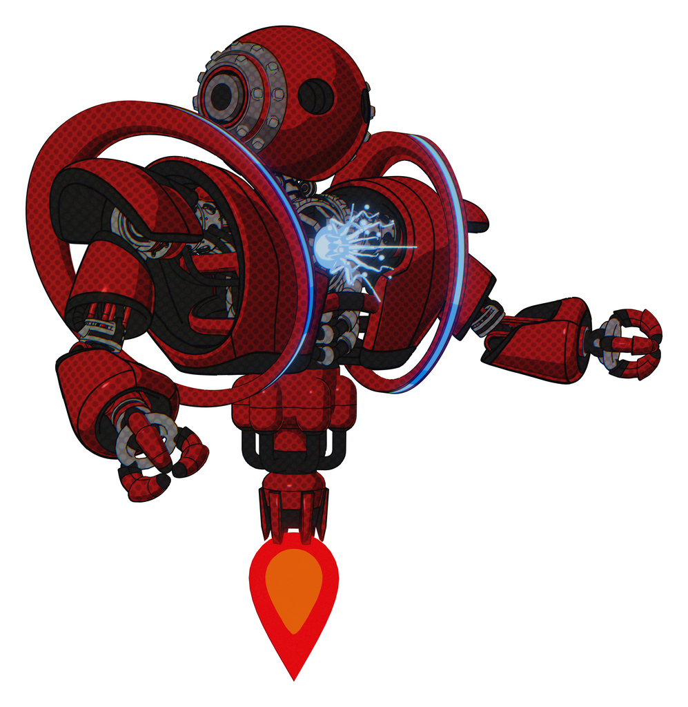 Automaton containing oval wide head and steampunk iron bands with bolts and heavy upper chest and heavy mech chest and spectrum fusion core chest and jet propulsion. Dark red. Interacting.
