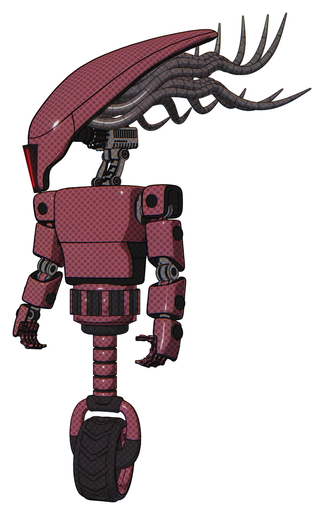 Robot containing flat elongated skull head and cables and light chest exoshielding and prototype exoplate chest and unicycle wheel. Muavewood halftone. Standing looking right restful pose.