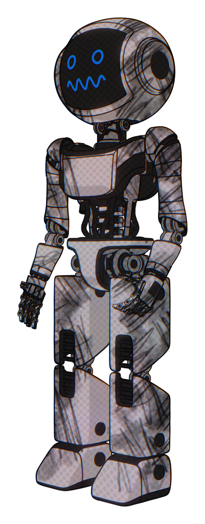 Cyborg containing digital display head and stunned expression and light chest exoshielding and ultralight chest exosuit and prototype exoplate legs. Scribble sketch. Facing right view.