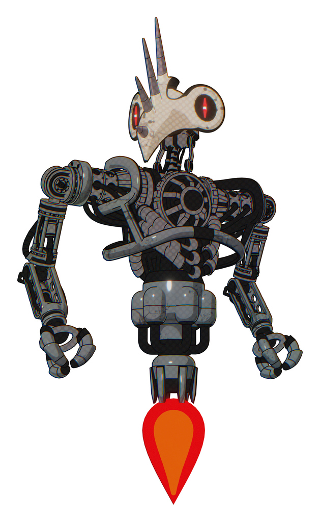 Cyborg containing bird skull head and red line eyes and heavy upper chest and no chest plating and jet propulsion. Patent concrete gray metal. Hero pose.