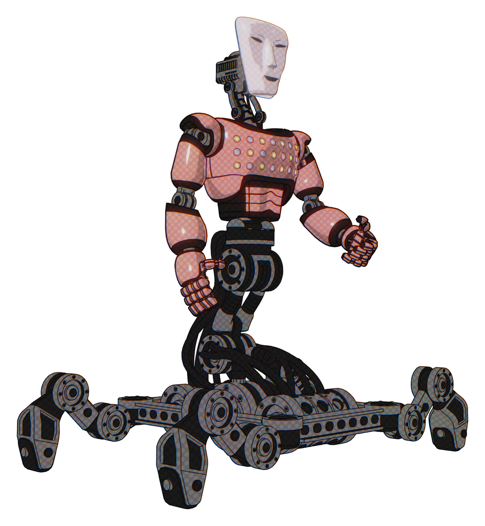 Bot containing humanoid face mask and light chest exoshielding and chest green blue lights array and insect walker legs. Toon pink tint. Facing left view.