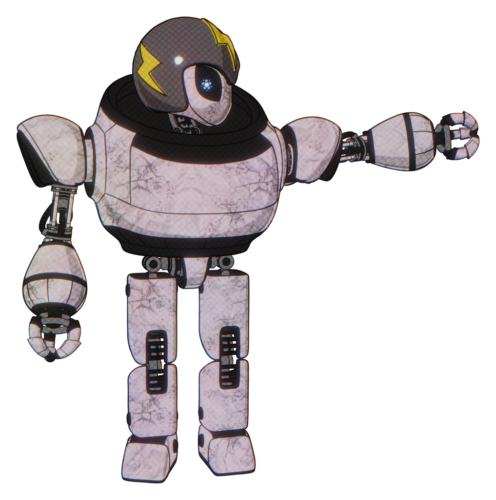 Droid containing grey alien style head and electric eyes and lightning bolts and gray helmet and heavy upper chest and prototype exoplate legs. Sketch pad. Pointing left or pushing a button..