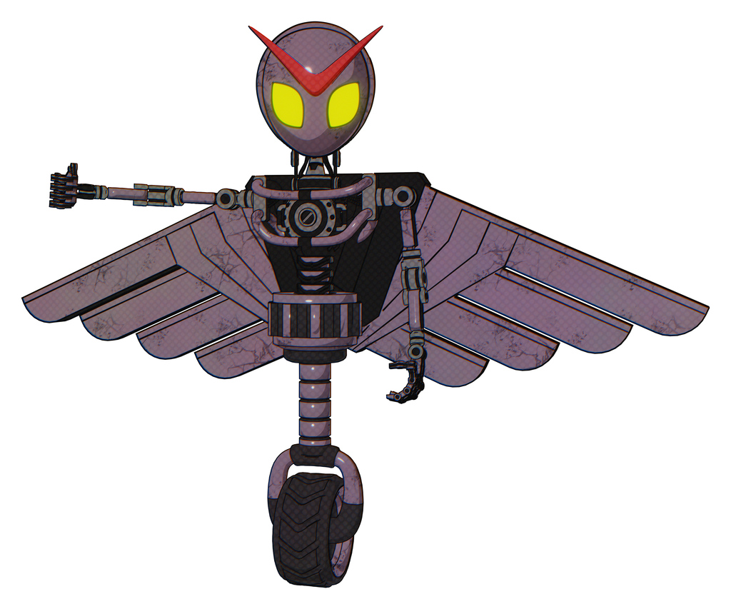 Cyborg containing grey alien style head and yellow eyes and light chest exoshielding and pilot's wings assembly and no chest plating and unicycle wheel. Lilac metal. Arm out holding invisible object..