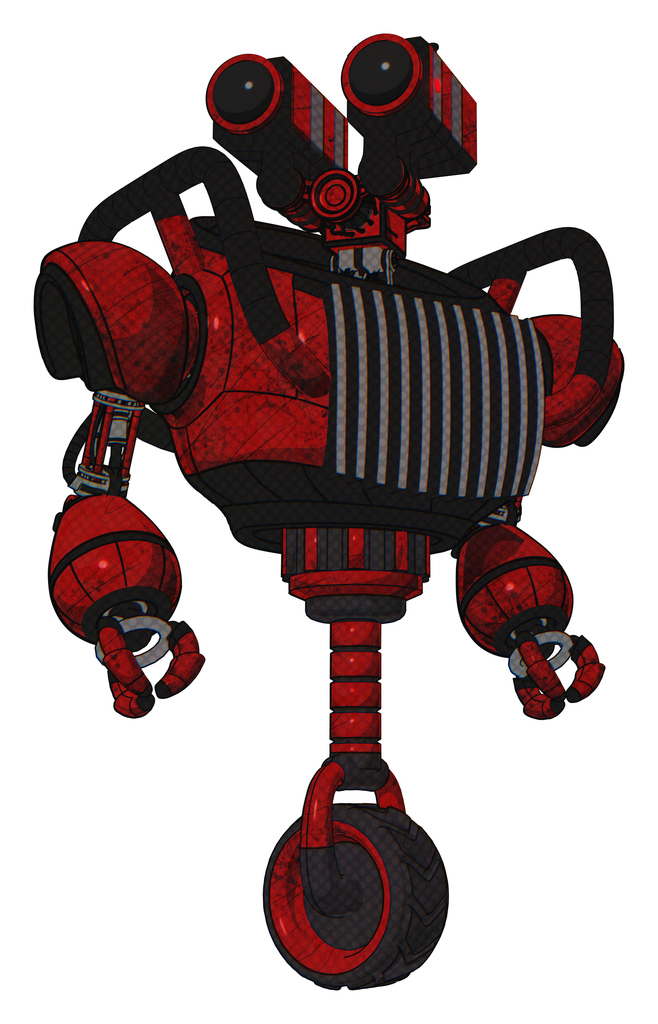 Robot containing dual retro camera head and heavy upper chest and chest vents and unicycle wheel. Red blood grunge material. Hero pose.