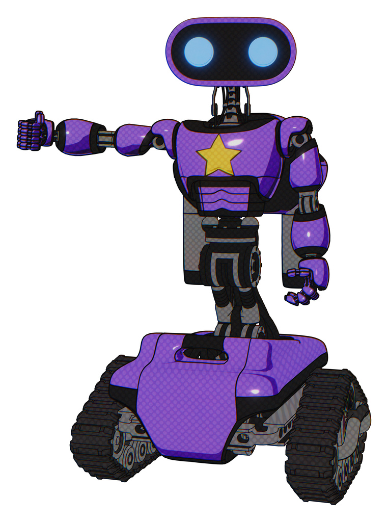 Droid containing elements: dual retro camera head, cute retro robo head, light chest exoshielding, yellow star, rocket pack, tank tracks. Material: Secondary purple halftone.