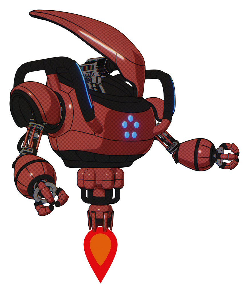 Mech containing flat elongated skull head and heavy upper chest and circle of blue leds and blue strip lights and jet propulsion. Light brick red. Interacting.