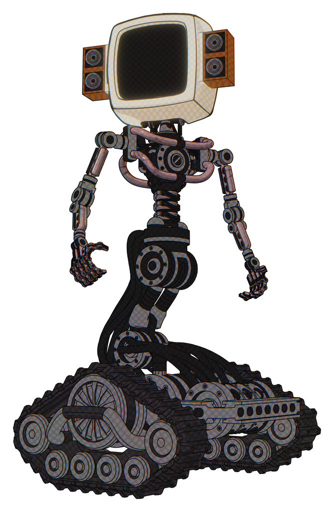 Cyborg containing old computer monitor and old retro speakers and light chest exoshielding and no chest plating and tank tracks. Grayish pink. Hero pose.