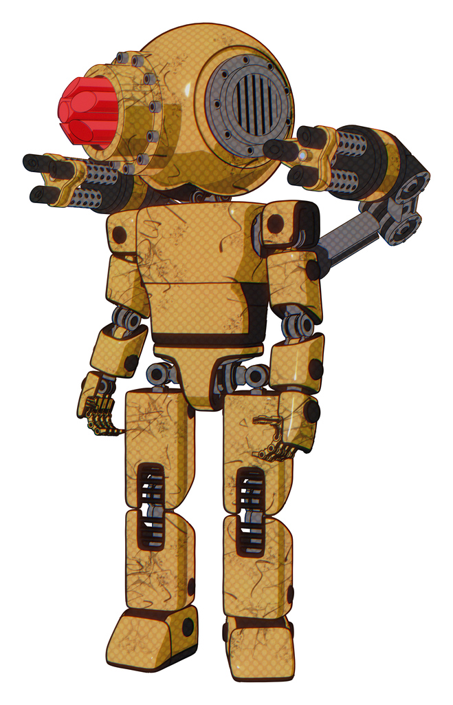 Mech containing round head and red laser crystal array and light chest exoshielding and prototype exoplate chest and minigun back assembly and prototype exoplate legs. Construction yellow halftone.