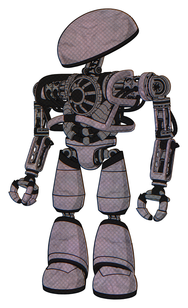 Cyborg containing dome head and heavy upper chest and no chest plating and light leg exoshielding. Dark sketch. Standing looking right restful pose.