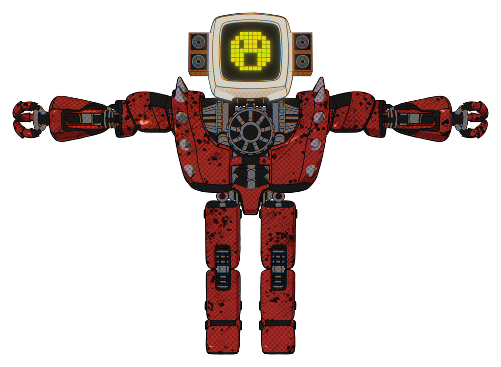 Bot containing old computer monitor and yellow pixel face surprised and old retro speakers and heavy upper chest and heavy mech chest and shoulder spikes and prototype exoplate legs.