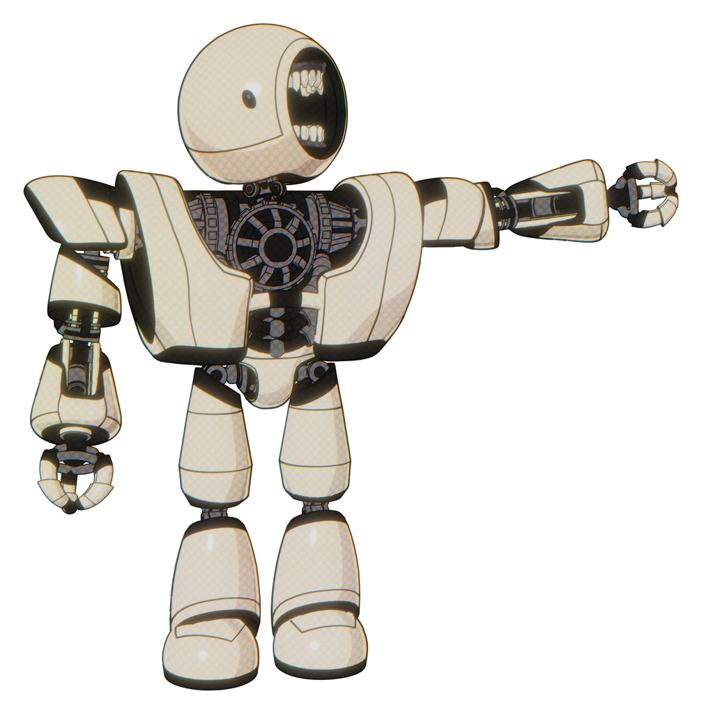 Cyborg containing round head chomper design and heavy upper chest and heavy mech chest and light leg exoshielding. Off white toon. Pointing left or pushing a button..