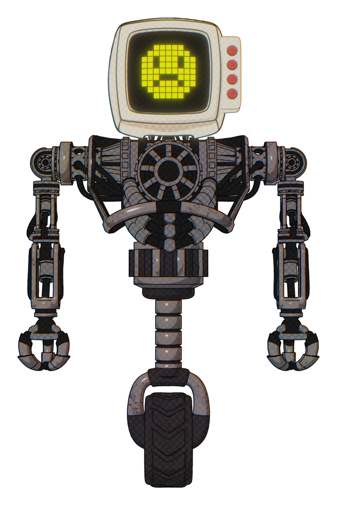 Droid containing old computer monitor and yellow sad pixel face and red buttons and heavy upper chest and no chest plating and unicycle wheel. Light pink beige. Front view.
