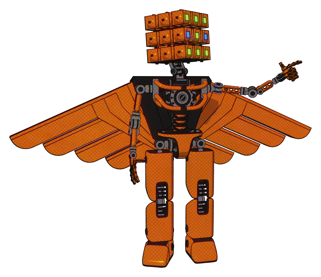 Robot containing dual retro camera head and cube array head and light chest exoshielding and pilot's wings assembly and no chest plating and prototype exoplate legs. Secondary orange halftone.