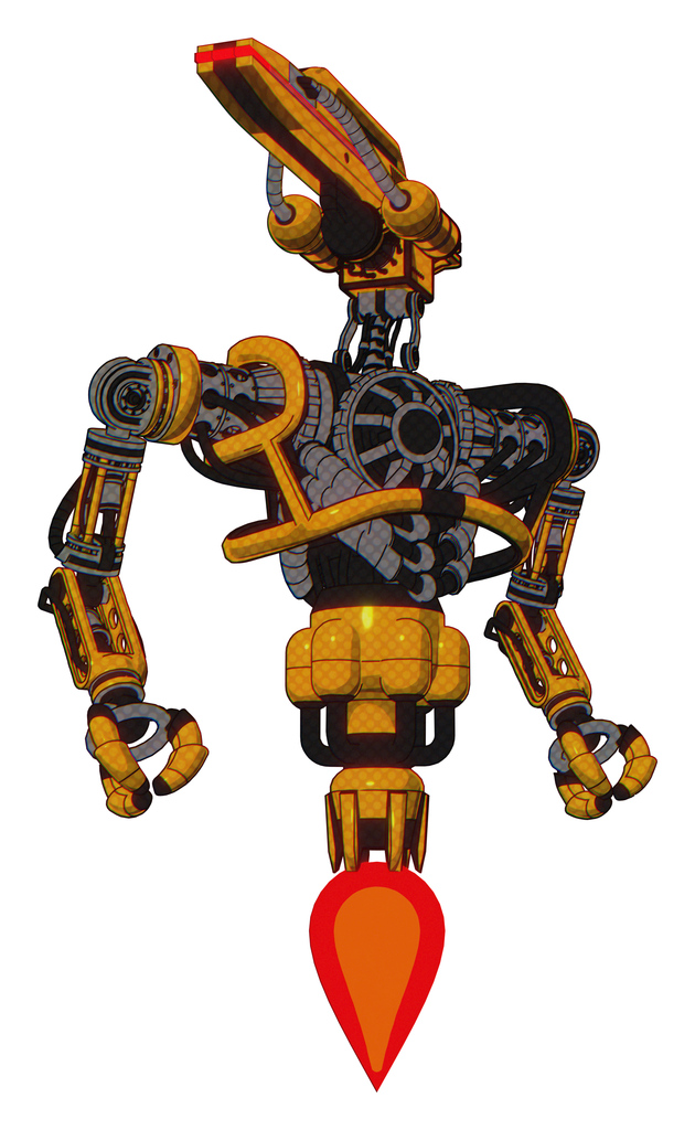 Automaton containing dual retro camera head and laser gun head and heavy upper chest and no chest plating and jet propulsion. Primary yellow halftone. Hero pose.