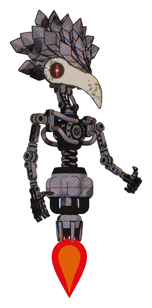 Automaton containing bird skull head and red line eyes and bird feather design and light chest exoshielding and no chest plating and jet propulsion. Sketch pad wet ink smudge. Facing left view.