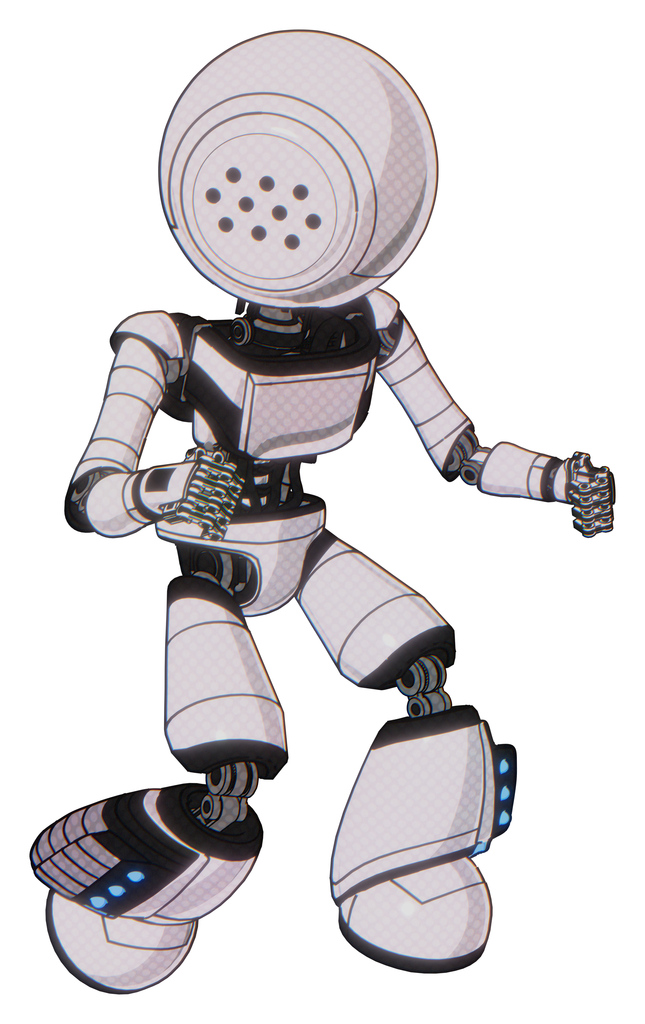 Automaton containing dots array face and light chest exoshielding and ultralight chest exosuit and light leg exoshielding and megneto-hovers foot mod. White halftone toon. Fight or defense pose..