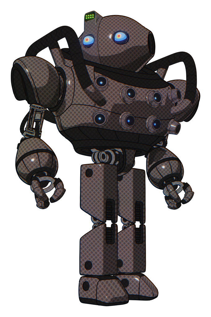 Robot containing oval wide head and blue eyes and green led ornament and heavy upper chest and chest energy sockets and prototype exoplate legs. Light brown. Hero pose.