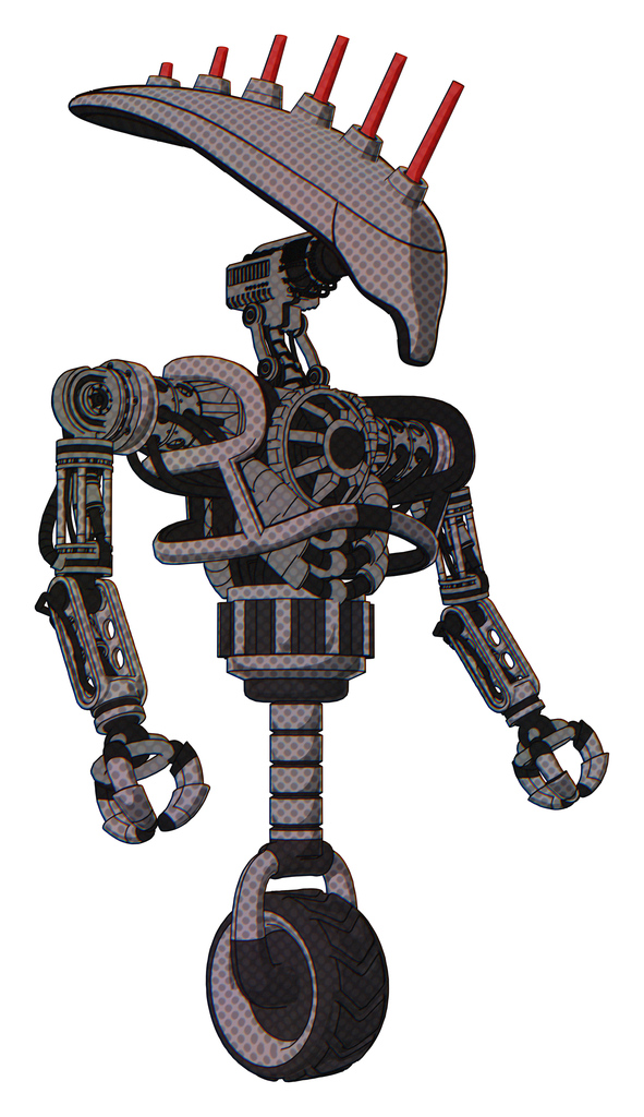 Mech containing flat elongated skull head and heavy upper chest and no chest plating and unicycle wheel. Halftone gray. Facing left view.