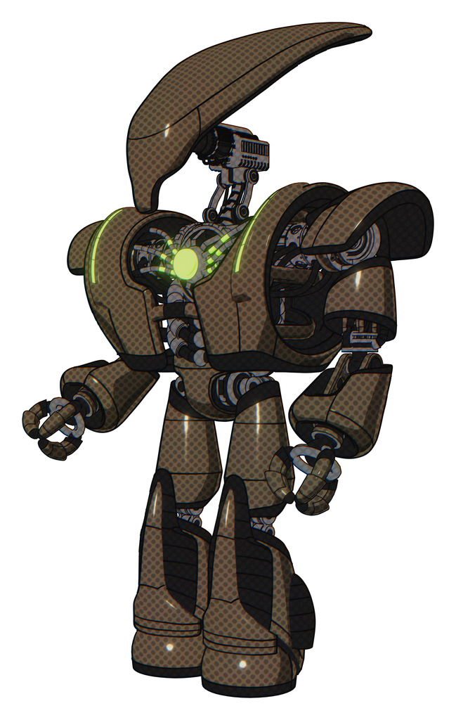 Mech containing flat elongated skull head and heavy upper chest and heavy mech chest and green energy core and light leg exoshielding and stomper foot mod. Light brown halftone. Facing right view.
