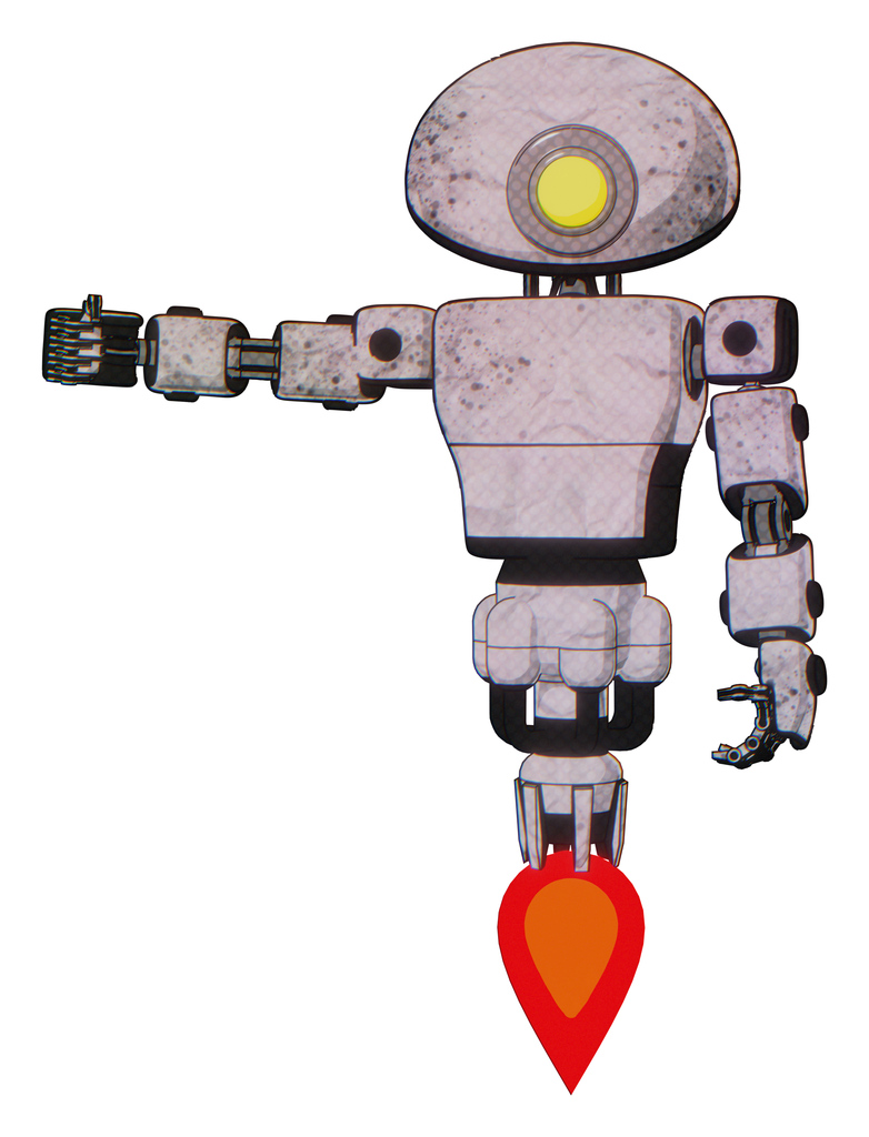 Robot containing yellow cyclops dome head and light chest exoshielding and prototype exoplate chest and jet propulsion. Sketch pad dirty smudge. Arm out holding invisible object..