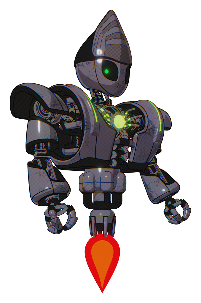 Mech containing grey alien style head and green inset eyes and heavy upper chest and heavy mech chest and green energy core and jet propulsion. Light lavender metal. Facing left view.