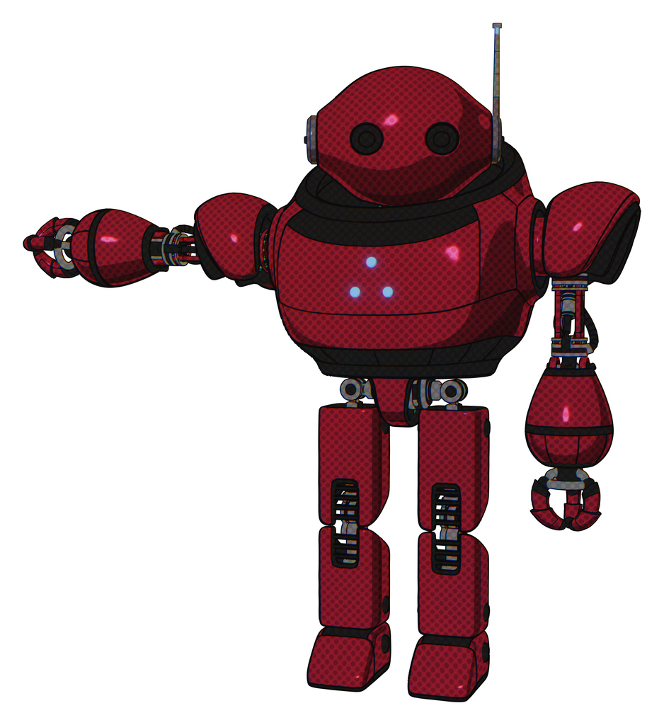 Cyborg containing oval wide head and retro antenna with light and heavy upper chest and triangle of blue leds and prototype exoplate legs. Fire engine red halftone. Arm out holding invisible object..