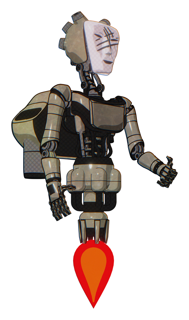 Mech containing humanoid face mask and slashes war paint and light chest exoshielding and ultralight chest exosuit and rocket pack and jet propulsion. Grungy fiberglass. Facing left view.
