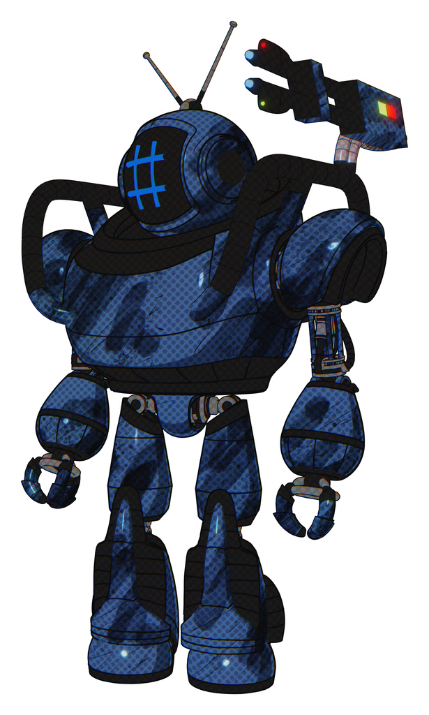 Automaton containing digital display head and hashtag face and retro antennas and heavy upper chest and light leg exoshielding and stomper foot mod. Grunge dark blue.