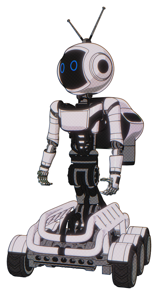 Mech containing digital display head and circle eyes and retro antennas and light chest exoshielding and ultralight chest exosuit and rocket pack and six-wheeler base. White halftone toon.