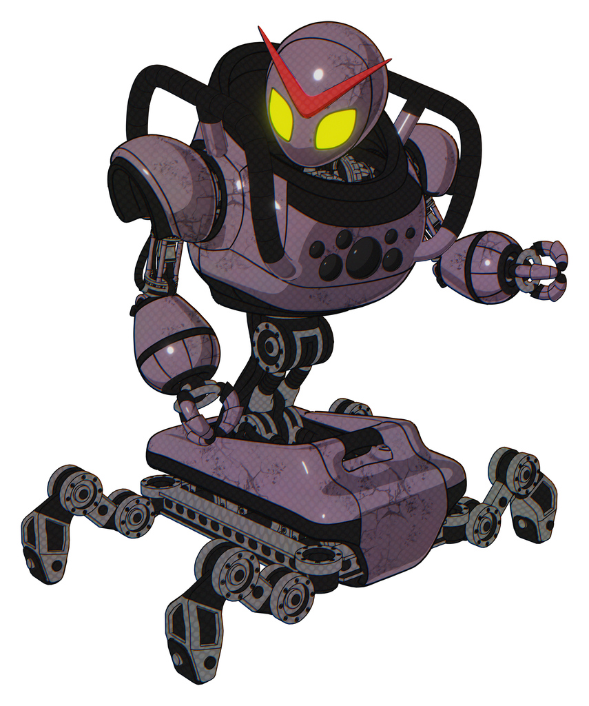 Mech containing grey alien style head and yellow eyes and heavy upper chest and chest compound eyes and insect walker legs. Lilac metal. Fight or defense pose..