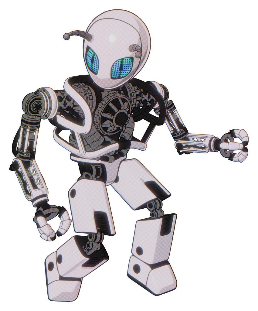 Robot containing grey alien style head and blue grate eyes and bug antennas and heavy upper chest and no chest plating and prototype exoplate legs. White halftone toon. Fight or defense pose..