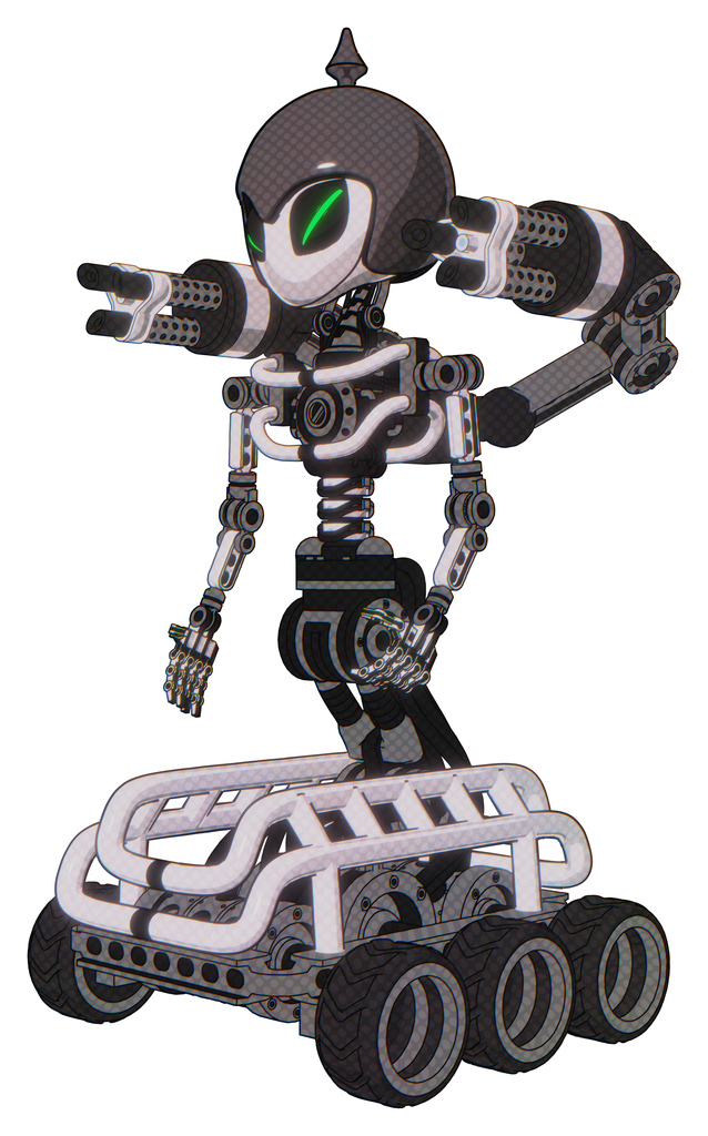 Cyborg containing elements: grey alien style head, green demon eyes, gray helmet, light chest exoshielding, minigun back assembly, no chest plating, six-wheeler base. Material: White halftone toon.
